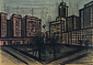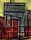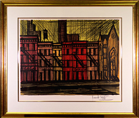 | 第二次世界大戦後、抽象絵画の洪水の中に若干20歳のビュッフェが鋭い デッサン力をもって《具象絵画の旗手》として画壇に登場したことはあま りにも有名である。作品はパリ国立美術館をはじめ、世界各国の美術館に 収蔵されている。硬質で鋭く太い、針金のような輪郭線、モノトーンに近 い色彩を特色とする、独自の様式を築き、その画面には人物の不安げな表 情などとあいまって、第二次大戦後の作者の不安で荒涼とした心象風景が 表されている。女性像のモデルは多くの場合、妻のアナベルである。油彩 画のみならず、優れた版画も多く制作している。 |