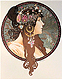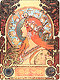 アルフォンスミュシャはオーストリア帝国のモラヴィア(現代のチェコ)イヴァンチッチェに生まれた。ブルノ中学校に入り教会の聖歌隊となり夏休みに合唱隊の聖歌集の表紙を描くなど絵を得意とした。ミュシャは中学校を中退、地方裁判所で働く。19歳でウィーンに行き舞台装置工房で働きながら夜間のデッサン学校に通う。2年後に失業。1883年ミュシャはミクロフでクーエン・ブラシ伯爵に会い、その弟のエゴン伯爵がパトロンとなる。ミュシャは25歳のときエゴン伯爵の援助でミュンヘン美術アカデミー入学、卒業し、28歳のときパリにてアカデミー・ジュリアンで美術を学んだ。ミュシャの出世作は1885年、舞台女優サラ・ベルナールの芝居のために制作した「ジスモンダ」のポスターである。威厳に満ちた人物と、細部にわたる繊細な装飾からなるこの作品は、当時のパリにおいて大評判となり、一夜にしてミュシャはアール・ヌーヴォーの旗手となり、彼のグラフィックデザイナーとしての地位を不動のものとした。またサラ・ベルナールにとっても、この「ジスモンダ」が、フランス演劇界の女王として君臨するきっかけとなった。その後もミュシャは「椿姫」、「メディア」、「ラ・プリュム」、「トスカ」など、サラ・ベルナールのポスターを制作している。 |